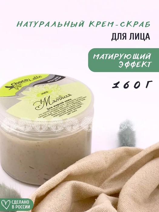 Крем-скраб МЯТНАЯ НУГА мягко очищает и сужает поры, нормализует жировой баланс, обеспечивает матовый цвет кожи.
