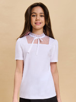 Стильная блузка станет отличным дополнением к вашему гардеробу! Модель выполнена из хлопкового полотна с добавлением эластана. Блузка с короткими пышными рукавами из шифона, она отлично подойдет для создания классных школьных образов!