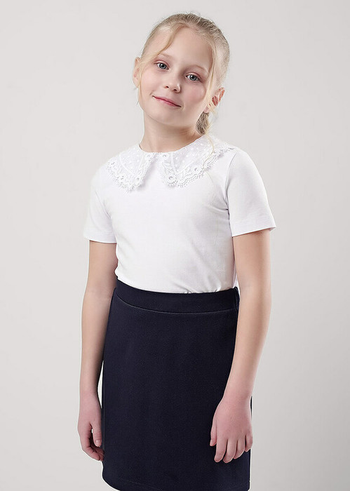 Базовая блузка с ажурным воротничком станет отличным дополнением к вашему гардеробу! Модель скоротким рукавом выполнена из хлопкового полотна с добавлением эластана. Блузка отлично подойдет для создания классных школьных образов!