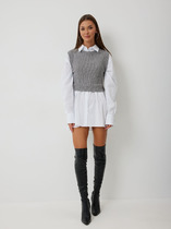 Джемпер без рукавов из трикотажного полотна джерси, среднее плечо. Двойной перед. По горловине спинки и пройме внутренняя узкая окантовка. Фигурный низ изделия.