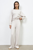 Брюки прямые, широкие из текстильного полотна штапель-креп. По талии притачной пояс на резинке с завязками из основного полотна.