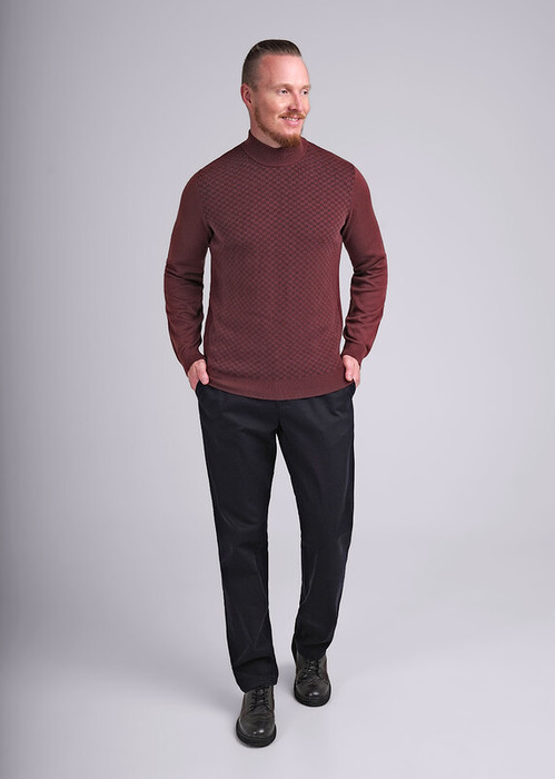 Мужская водолазка с воротником-стойкой и длинным рукавом. Выполнена из смесовой пряжи с большим содержанием хлопка. Модель с геометрическим орнаментом по переду, подходит для формальных и повседневных встреч.
