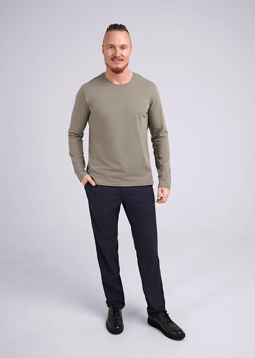 Джемпер прямого силуэта, длинный рукав, круглый вырез горловины обработан обтачкой. Изделие выполнено из натурального полотна с добавлением эластана для удобства ношения.