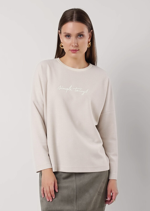 Джемпер свободного кроя из трикотажного полотна. Длинный рукав со спущенной линией плеча. Округлая горловина с вязанной обтачкой. Спереди вышивка. Сзади средний шов.