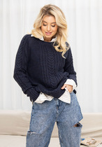 Вязаный джемпер прямого силуэта из вискозной пряжи с добавлением нейлона. Длинный втачной рукав. Основное переплетение гладь. Округлая горловина с бейкой. По низу изделия и рукавов узкие манжеты, нашивка металл.