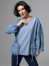 Вязаный джемпер умеренного объема из акриловой пряжи с добавлением хлопка, переплетение полуфанг. Округлая горловина с бейкой. Длинный рукав со спущенной линией плеча. По низу изделия и рукава манжет. Спереди нашивка металл.