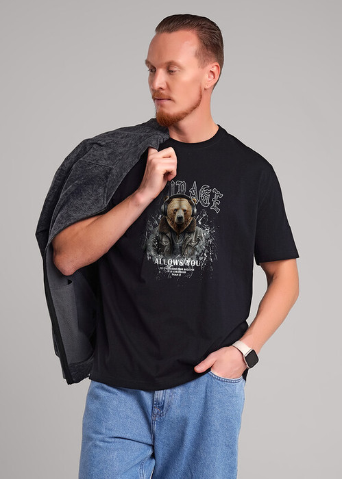 Футболка увеличенного объема из трикотажного плотного, гладкого полотна. Короткие рукава с манжетами. Изделие дополнено дизайнерским принтом. Отличный вариант для встреч с друзьями.
