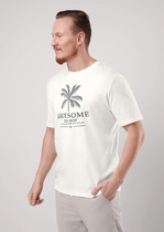 Футболка мужская с V-образным вырезом горловины и коротким втачным рукавом из фактурного полотна ""флам"". Данная модель дополнена контрастными отделочными строчками по боковым швам и шрифтовыми принтами. Можно сочетать с брюками или шортами.