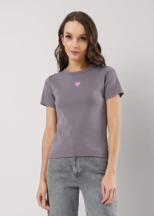 Футболка укороченная, прилегающего силуэта из хлопкового трикотажного полотна с эластаном- рибана. Округлый вырез горловины с окантовкой. Короткий втачной рукав. Спереди нашивка.