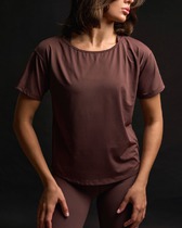 Футболка из трикотажного полотна с добавлением модала. Округлая горловина с окантовкой. Короткий втачной рукав. Спереди кокетка, нижняя часть переда двойная.