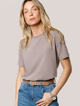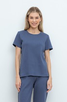 Джемпер умеренного объема из хлопкового трикотажного полотна -рибана. Втачной короткий рукав. Округлая горловина с окантовкой.