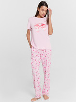 Халат из трикотажного полотна свободного кроя, на запах. По талии пояс со шлевками и внутренними завязками. По горловине и борту окантовка. Спущенная линия плеча, с коротким рукавом. По бокам накладные карманы. По низу рукава и изделия -рюша.