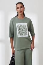 Толстовка для дома и отдыха свободного кроя из трикотажного полотна пике. Длинный рукав со спущенной линией плеча.По горловине капюшон со шнуром. По низу рукава манжет с внутренней резинкой, по низу изделия манжет, нашивка. Спереди принт.
