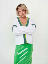 Вязаный жакет умеренного объема,средней длины из акриловой пряжи с застежкой на пуговицы. V -образная грловина. Спущенная линия плеча. По бокам разрезы.