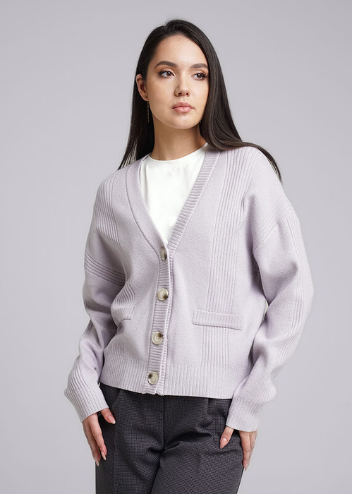 Вязаный джемпер прямого силуэта из вискозной пряжи. V-образный вырез горловины с застежкой на пуговицы. Спущенная линия плеча. По переду, рукаву и пройме декоративные полосы разбором.Спереди имитация кармана листочка. По низу изделия и рукавов манжеты.