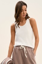 Майка из хлопкового трикотажного полотна рибана. Умеренный объем. Широкая бретель, округлая горловина. По горловине и пройме окантовка.