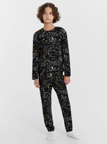 Новогодняя хлопковая пижама из футболки и брюк. Горловина , манжеты по низу брюк из эластичного полотна. Футболка свободного кроя, тематический принт по переду. Брюки среднего объема, эластичный пояс обеспечит комфорт и идеальную посадку.