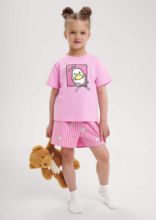 Комплект хлопковой пижамы из футболки и шорт. Футболка свободного кроя дополнена эластичной горловиной и стильным принтом. Шорты среднего объема, эластичный пояс обеспечит комфорт и идеальную посадку.