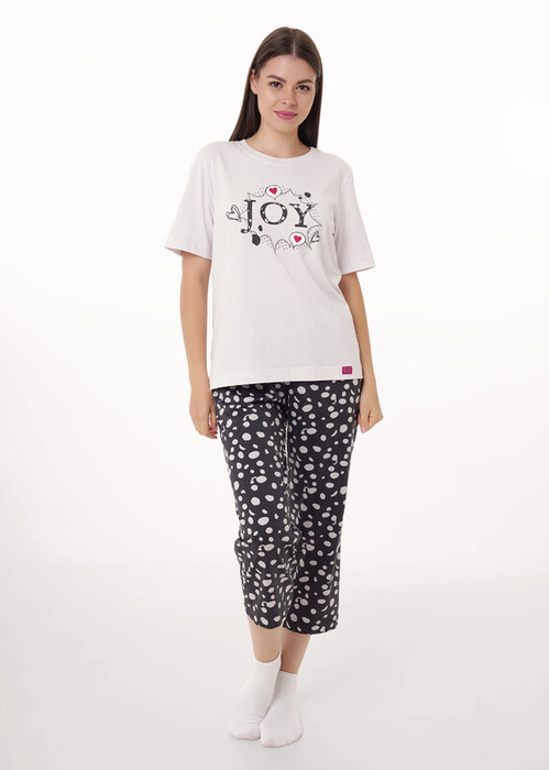 Набор одежды из хлопкового трикотажного полотна. Футболка прямого кроя, короткий втачной рукав, округлая горловина с обтачкой. Спереди принт. Внизу нашивка. Бриджи с поясом на внутренней резинке. Боковые карманы с отрезным бочком.