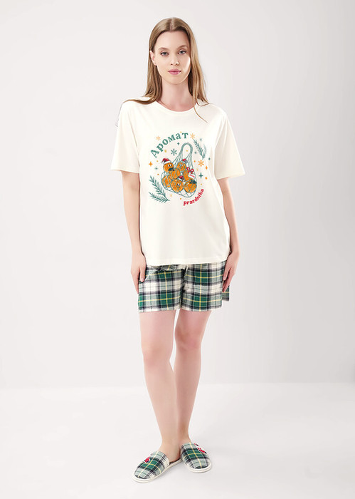 Пижама из хлопкового трикотажного полотна. Футболка прямого кроя. Короткий втачной рукав. Округлая горловина с обтачкой. Спереди принт. В боковом шве вшивка. Шорты из трикотажного полотна с карбоном прямые, пояс на внутренней резинке с киперной лентой.