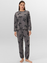Набор одежды из трикотажного полотна.Футболка с коротким втачным рукавом,отворотом и закрепкой. По горловине обтачка.Спереди принт, нашивка в боковом шве. Брюки с поясом на резинке и киперной лентой. Боковые карманы с отрезным бочком. Внизу брюк резинка.