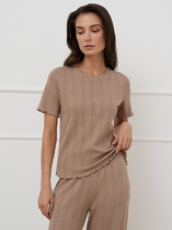 Пижама для дома.Футболка из трикотажного полотна. Округлая горловина с обтачкой. Втачной короткий рукав. Сзади средний шов.Спереди принт, нашивка.Шорты длинные, облегающие из трикотажного полотна кашкорсе.По талии притачная резинка жаккард, нашивка.