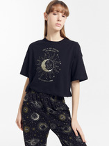 Набор одежды из хлопкового трикотажного полотна с модалом. Футболка прямого кроя. Короткий спущенный рукав. По горловине обтачка с кружевом. Спереди нашивка, сзади принт. Брюки прямые с поясом на внутренней резинке. По боковым швам узкое кружево, 2 ряда.