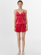 Пижама для дома из хлопкового трикотажного полотна. Майка прямого силуэта, на узких бретелях. По горловине и пройме окантовка. Короткие шорты свободного кроя, цельнокроеный пояс на внутренней резинке.