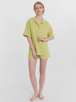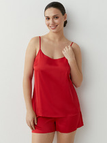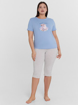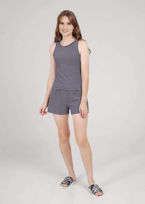 Пижама для дома из эластичного хлопкового полотна. Майка умеренного объема. Узкая бретель, округлая горловина,по горловине,пройме окантовка. Короткие шорты свободного кроя, цельнокроеный пояс на внутренней резинке. Спереди имитация гульфика.
