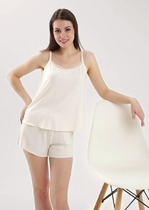Пижама для дома и отдыха из вискозного трикотажного полотна кашкорсе лапша.Майка прилегающего силуэта. Спереди по горловине кружево, по спинке обтачка.По пройме узкая обтачка. Шорты по талии пояс на внутренней резинке. По низу майки и шорт узкий оверлок.