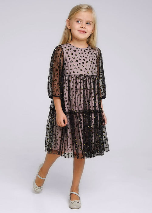 Нарядное двухслойное платье для девочки - отличный вариант для любого мероприятия или фотосессии. Рукава со сборкой по низу выполнены из мягкой блестящей сетки. Нижний слой платья - из кулирки 100% хлопок, верхний слой - из сетки, как на рукавах.