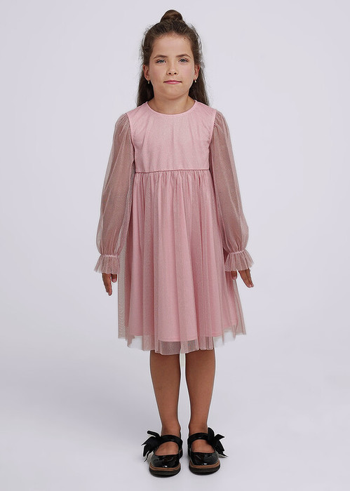 Воздушное как облако! Нарядное платье для девочки - готовый образ на любой праздник! Длинный рукава со сборкой по низу выполнен из мягкой мерцающей сетки. Нижний слой платья - из хлопка 100%, верхний слой - из сетки, как на рукавах. Завышенная талия.
