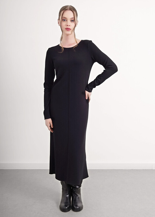 Платье миди из трикотажного полотна силаник, прямого кроя. Округлая горловина. Длинный втачной рукав. По переду вертикальный защип, по спинке средний шов. По низу рукава и изделия мелкий оверлок.