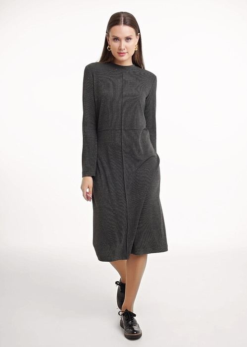 Платье прямого силуэта из трикотажного полотна рибана с вискозой. Длиной ниже колена. Округлая горловина с обтачкой. По переду и спинке вертикальные и горизонтальные защипы. Длинный втачной рукав.