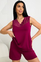 Платье свободного силуэта из хлопкового трикотажного полотна с добавлением модала. Короткий слегка спущенный рукав. По горловине обтачка с кружевом. По талии рез с присборенной юбкой. По бокам узкое кружево 2 ряда. Спереди нашивка, сзади принт.
