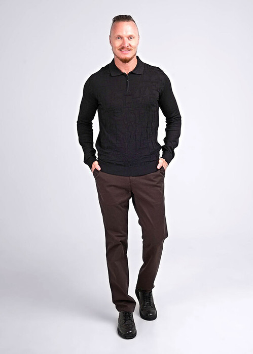Мужское вязаное поло на молнии с длинным рукавом. Модель связана из приятной хлопковой пряжи с добавлением акрила с вывязанным графическим узором по переду. Изделие можно сочетать как в классическом стиле, так и в повседневном.