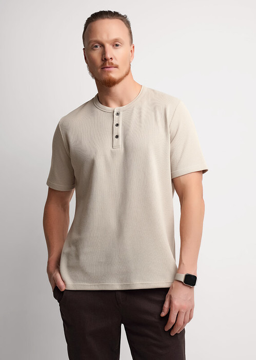 Футболка-поло с воротником-стойка и функциональной планкой на пуговицах, из трикотажного полотна ""вафля"". Изделие дополнено имиджевой фурнитурой и отделочными строчками. Простая и удобная модель, идеально подходящая для повседневного гардероба.