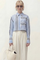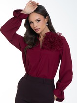 Блузка из текстильного полотна лен с вискозой,прямого силуэта. Длинный рукав со спущенной линией плеча, по низу манжет с разрезом. По борту цельновыкроенная планка с застежкой на пуговицы, по горловине отложной воротник со стойкой. По бокам разрезы.