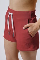 Женские шорты с высокой посадкой. По талии широкая резинка, обеспечивающая комфортную посадку. По бокам декоротивные вставки в рубчик.