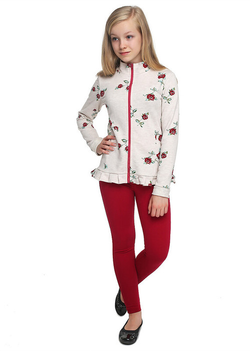 Романтичная куртка из футера на молнии. Низ изделия оформлен оборкой в складку. По переду рельефы для приталивания силуэта . Низ рукава с манжетой из изнаночной стороны полотна. горловина со стойкой . впереди тематический принт