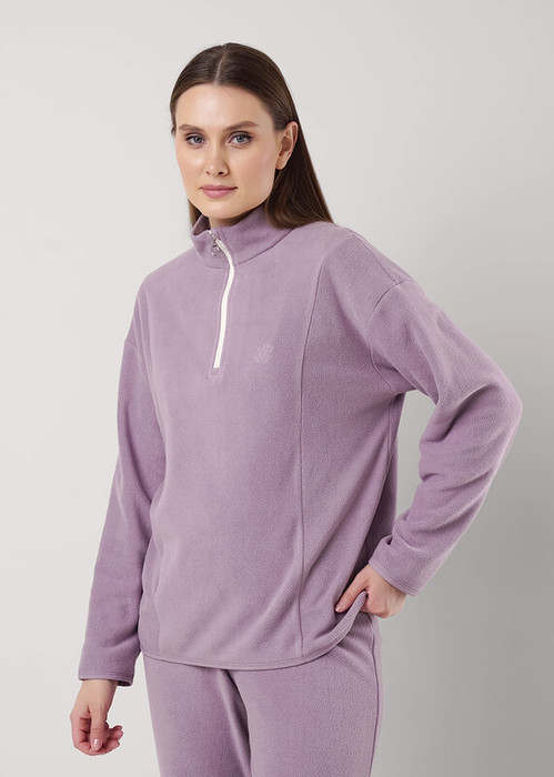Джемпер спортивный прямого силуэта из трикотажного полотна флис. По горловине стойка с молнией. Спереди рельефы. Длинный рукав со спущенной линией плеча. По низу рукава и низа изделия окантовка. Спереди вышивка.