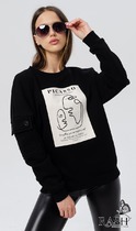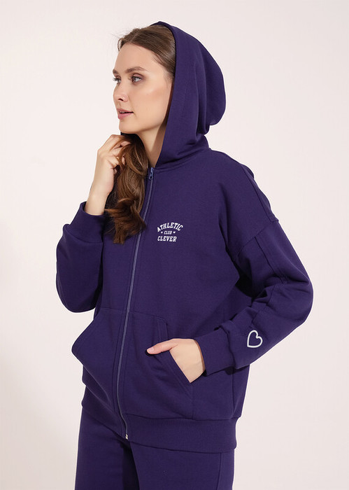 Куртка спортивная из трикотажного полотна футер,на молнии. По горловине капюшон на подкладе со шнуром. Длинный рукав со спущенной линией плеча, нашивка.По низу рукава и изделия манжеты. Спереди карман кенгуру, принт.По пройме и шву рукава открытый срез.