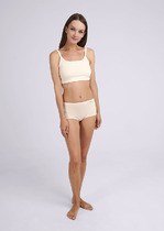 Майка топ укороченная из трикотажного полотна кашкорсе лапша с эластаном. Средняя ширина бретели. Округлый вырез горловины. По горловине, пройме окантовка. По низу изделия внутренняя резинка, по центру жаккардовая нашивка.