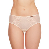 Бикини комфортной посадки из сетки. По ножкам -кружевная тесьма, по поясу - резинка с фестоном. По переду - симметричные кружевные вставки и небольшой атласный бант.