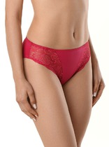 Передняя деталь изделия выполнена из эластичного полотна. Задняя деталь выполнена из эластичного кружева с фестонами, декорирована бантиком из атласной ленты. Внутренняя ластовица выполнена из хлопкового полотна.