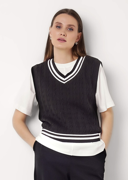 Вязаный жилет умеренного объема из хлопковой пряжи с добавлением акрила. V-образный вырез горловины. По переду косы, по спинке гладь. По низу изделия и бейке горловины контрастные полоски черного цвета.
