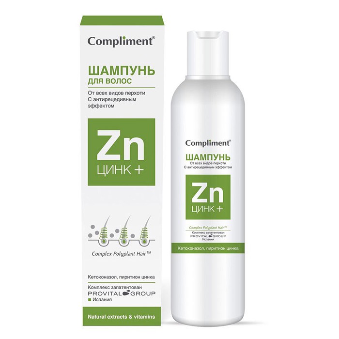 Бальзам-маску Compliment Цинк +. Средство наносится на волосы на 3-5 минут после каждого мытья головы.