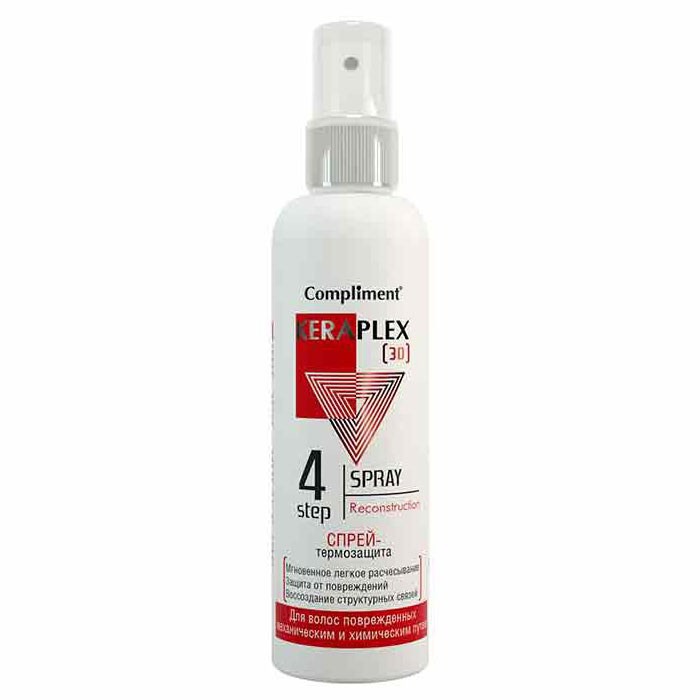 Легкий спрей – термозащита Compliment Keraplex заполняет и укрепляет внутреннюю структуру волоса, воссоздавая миллионы поврежденных связей, создавая крепкую сцепку фибрилл внутри волоса. Спрей защищает волосы от высоких температур фена или утюжка.