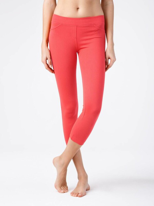 Эластичные укороченные леггинсы - хит наступающего весенне-летнего сезона. Модель выполнена из современного материала, который прекрасно облегает фигуру. Спереди имеются декоративные карманы и имитация клапана-застежки, а сзади - накладные карманы.