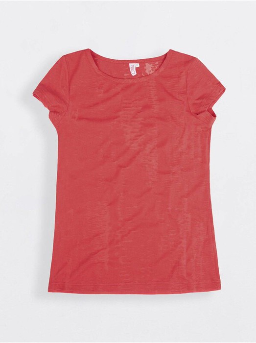Джемпер женский из однотонного трикотажного полотна с эффектом "вытравка" с коротким втачным рукавом. Круглая головина изделия окантована бейкой.